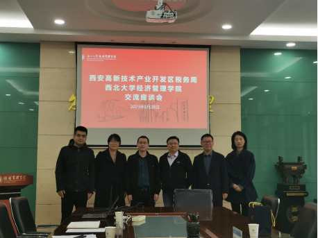 2023年3月28日上午,国家税务总局西安市高新技术产业开发区税务局副局长成苏涛、税务局人教科科长陈颖来到冰球突破豪华版官方网站就建立“税+校”实习实践交流合作等各项事宜进行洽谈。冰球突破豪华版官方网站副院长李辉、会计学系党支部书记韩少真以及教师代表郭宏、陈怡欣参加了此次座谈会。