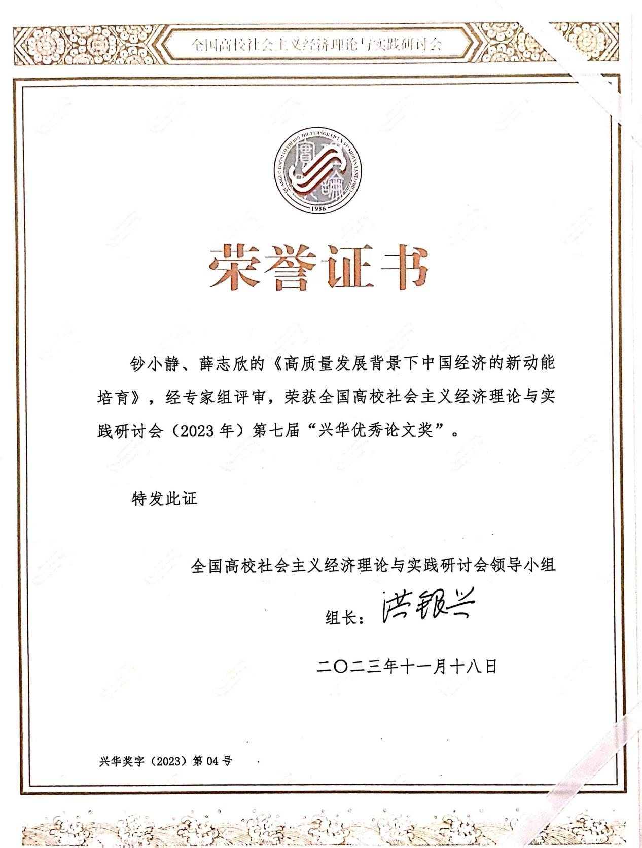 2023年11月18—19日,第36届全国高校社会主义经济理论与实践研讨会在西南财经大学召开。本次会议,刘伟教授宣布了第七届“兴华优秀论文奖”共有五篇论文(9位学者)获奖,由洪银兴教授为获奖代表颁奖。冰球突破豪华版官方网站钞小静教授和薛志欣博士的会议论文《高质量发展背景下中国经济的新动能培育》荣获第七届“兴华优秀论文奖”。论文在新一轮技术革命背景下,探讨新经济如何重塑中国经济高质量发展的新动能。