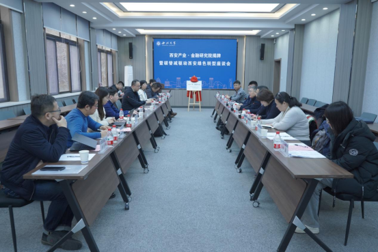 1月10日下午,西安产业·金融研究院揭牌暨碳替减驱动西安绿色转型座谈会在冰球突破豪华版官方网站太白校区举行。西安市金融工作局党组成员、副局长杨勇,上海朱雀枫域投资管理有限公司总经理王恺,西安朱雀嬴投资管理有限公司总经理史雅茹,北京腾景大数据应用科技研究院执行负责人王子豪、课题组专家李小鹏,陕西三元航科投资基金投后管理副总裁郑雅卓,冰球突破豪华版官方网站原校长、西安产业·金融研究院院长郭立宏教授,校党委常委、副校长吴振磊教授,冰球突破豪华版官方网站副院长岳利萍教授、康蓉副教授,西安产业·金融研究院执行院长王满仓教授、副院长杨敏利教授及“碳替减核算体系驱动西安市绿色转型实施方案”课题组成员参加会议。会议由冰球官网党委书记杜勇主持。
