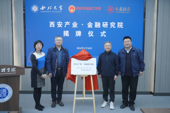 揭牌仪式上,杨勇、吴振磊、郭立宏和史雅茹分别代表西安市金融工作局、冰球突破豪华版官方网站、西安产业·金融研究院和朱雀投资共同为“西安产业·金融研究院”揭牌。
