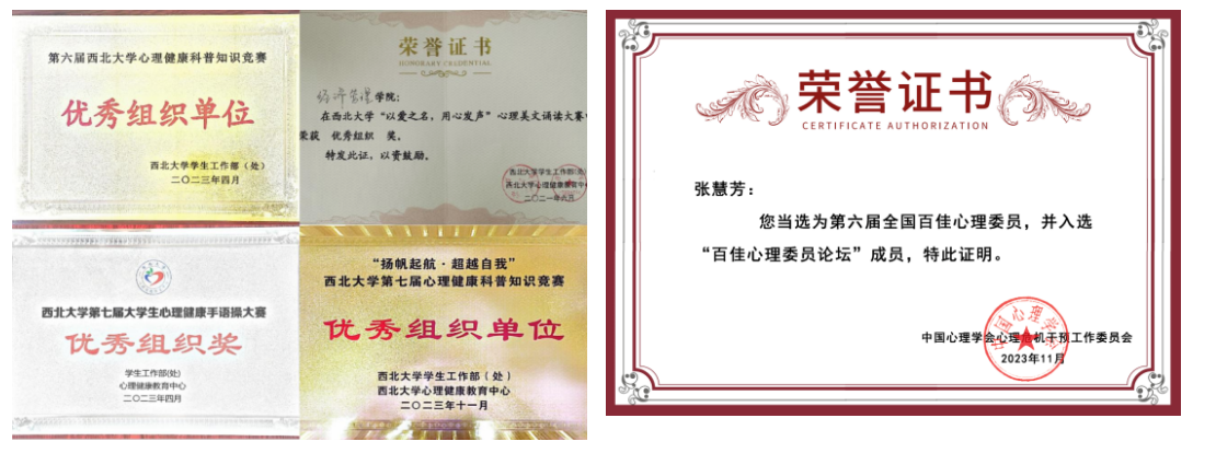 学院荣获“心相遇·爱同行”心理健康教育伴我成长主题征文活动、心理漫画大赛、心理美文诵读大赛、手语操大赛优秀组织单位等荣誉称号;立项校级学生朋辈心理育人项目1项并结项;承办学校第七届心理健康科普知识竞赛;1人荣获全国百佳心理委员荣誉称号。