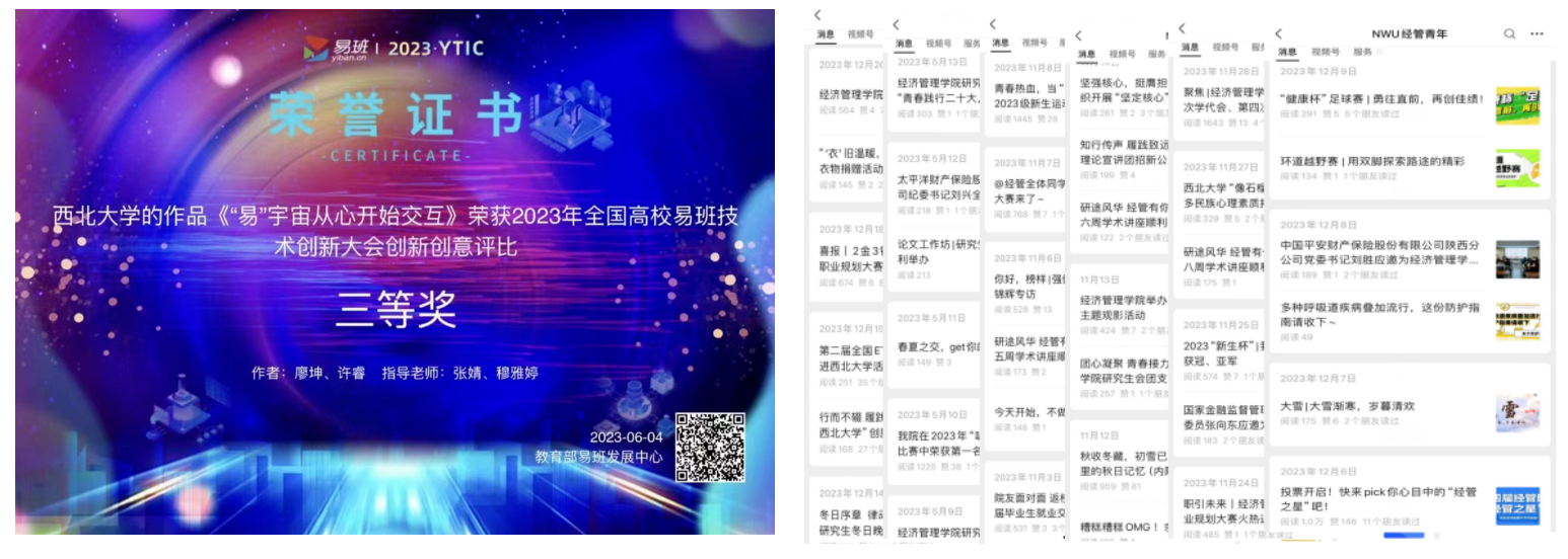 构建“融媒体+育人”工作体系,利用学院官网、“NWU经管青年”公众号、视频号等开展网络思政教育,不断优化网络思想政治教育载体内容,提高网络思想政治教育的导向性和吸引力,传播正能量,弘扬网络文化主旋律。
