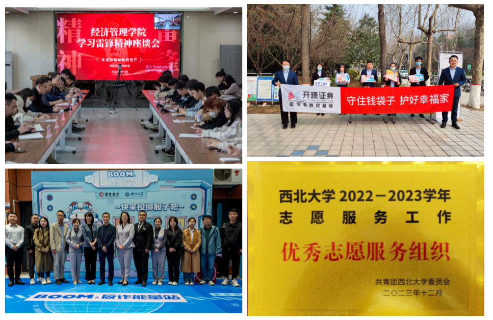 开展“雷锋精神永传承,青春志愿我先行”雷锋活动月系列活动、植树节劳动教育活动;与开源证券开展防金融诈骗宣传活动;联合学校第24届研支团赴富平“金融知识进课堂,同心童行向未来”志愿科普主题活动;与招商银行西安分行联合开展”反诈游园会“活动;学院荣获2022-2023年度优秀志愿服务组织荣誉称号。