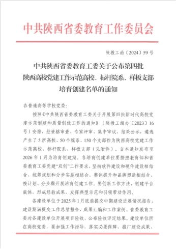 近日,省委教育工委公布了第四批陕西高校党建工作示范高校、标杆院系、样板支部培育创建名单。冰球官网党委入选全省党建工作标杆院系培育创建单位名单。截至目前,冰球官网已有1个党支部入选“全国党建工作样板支部”培育创建单位名单,2个党支部入选全省高校党建“双创”样板支部建设名单。