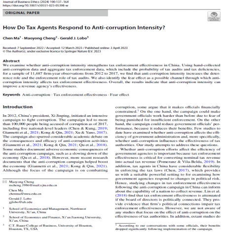 近期,冰球官网供应链会计与审计团队的马晨教授与西安交通大学经济与金融学院的程茂勇教授、美国休斯顿大学的Gerald J. Lobo合作的论文《How Do Tax Agents Respond to Anti‑corruption Intensity》,在FT50权威期刊《Journal of Business Ethics》发表(ABS 4;JCR一区;近五年影响因子8.1)。