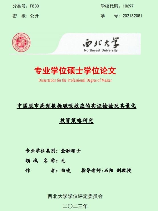 近日,由冰球官网石阳副教授指导2021级金融专硕白峻同学撰写的硕士学位论文《中国股市高频数据磁吸效应的实证检验及其量化投资策略研究》,成功入选了中国金融专业学位论文中心(本年度全国共有34篇论文入选)。