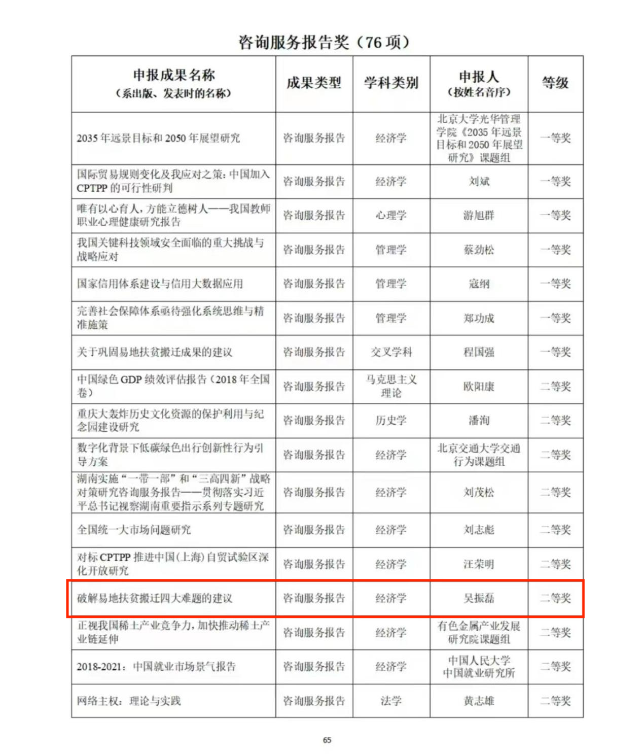 近日,教育部公示了第九届高等学校科学研究优秀成果奖(人文社会科学)获奖名单,冰球官网教授吴振磊副校长的研究成果《破解易地扶贫搬迁四大难题的建议》获教育部第九届高等学校科学研究优秀成果奖二等奖(咨询服务报告奖)。