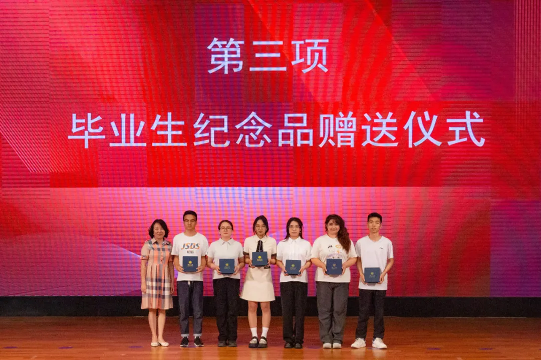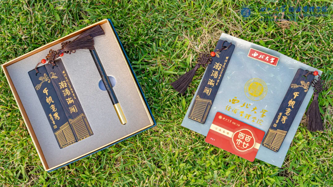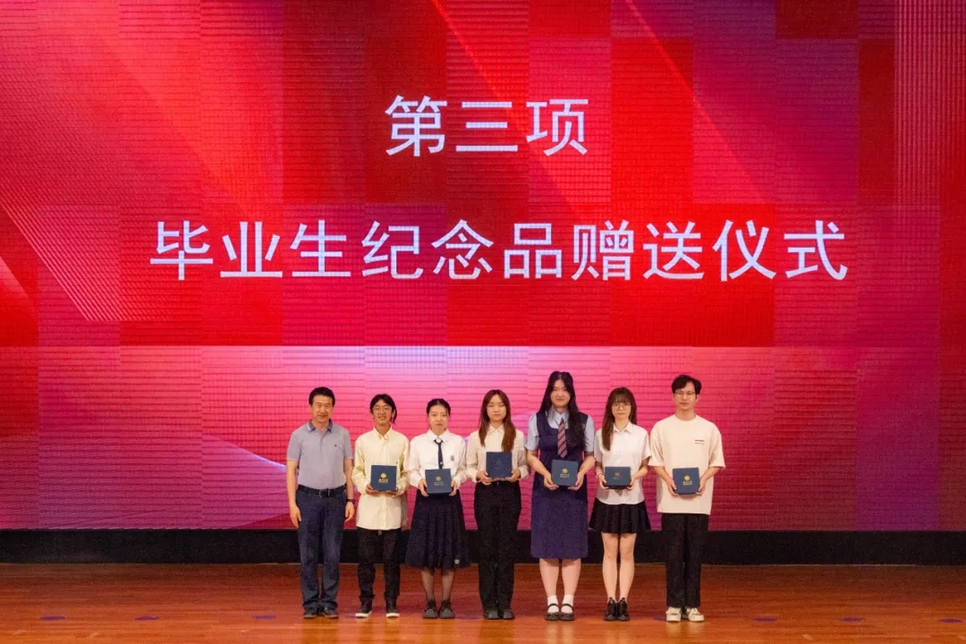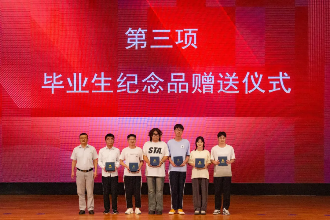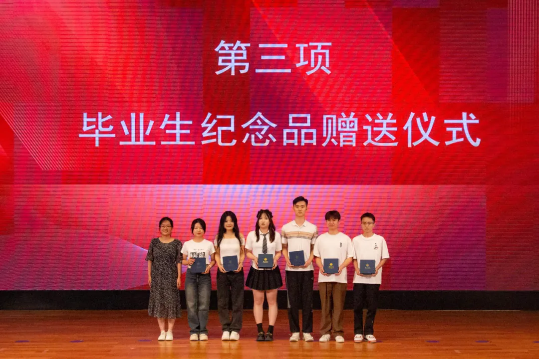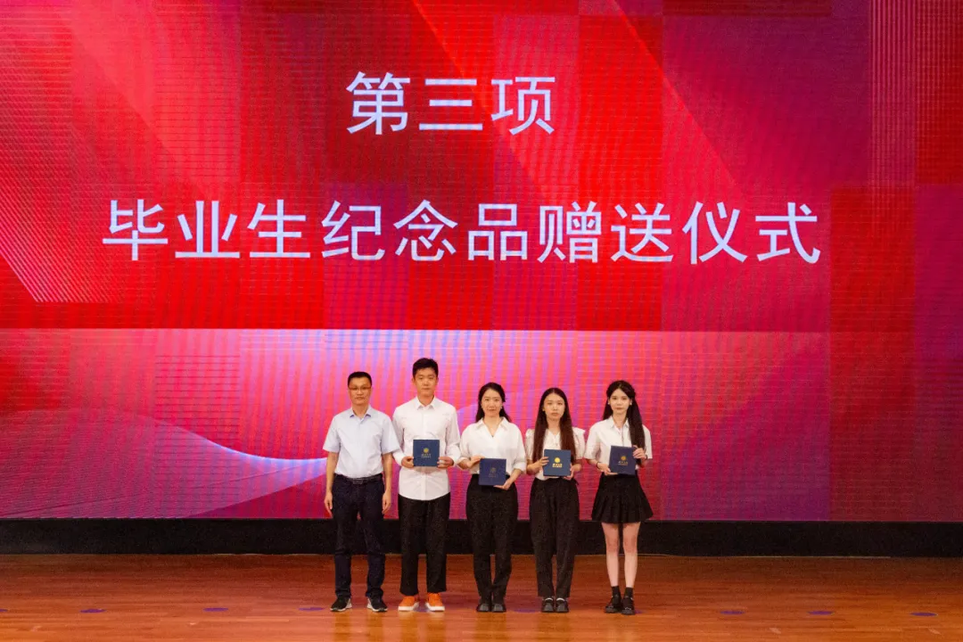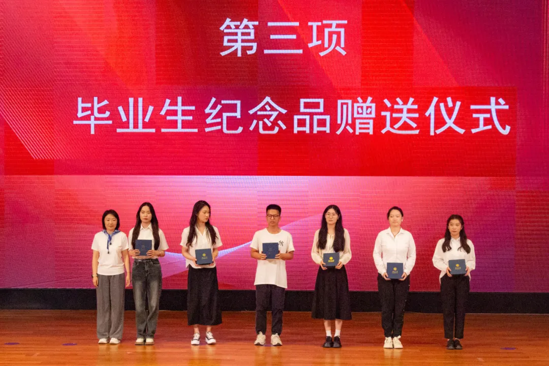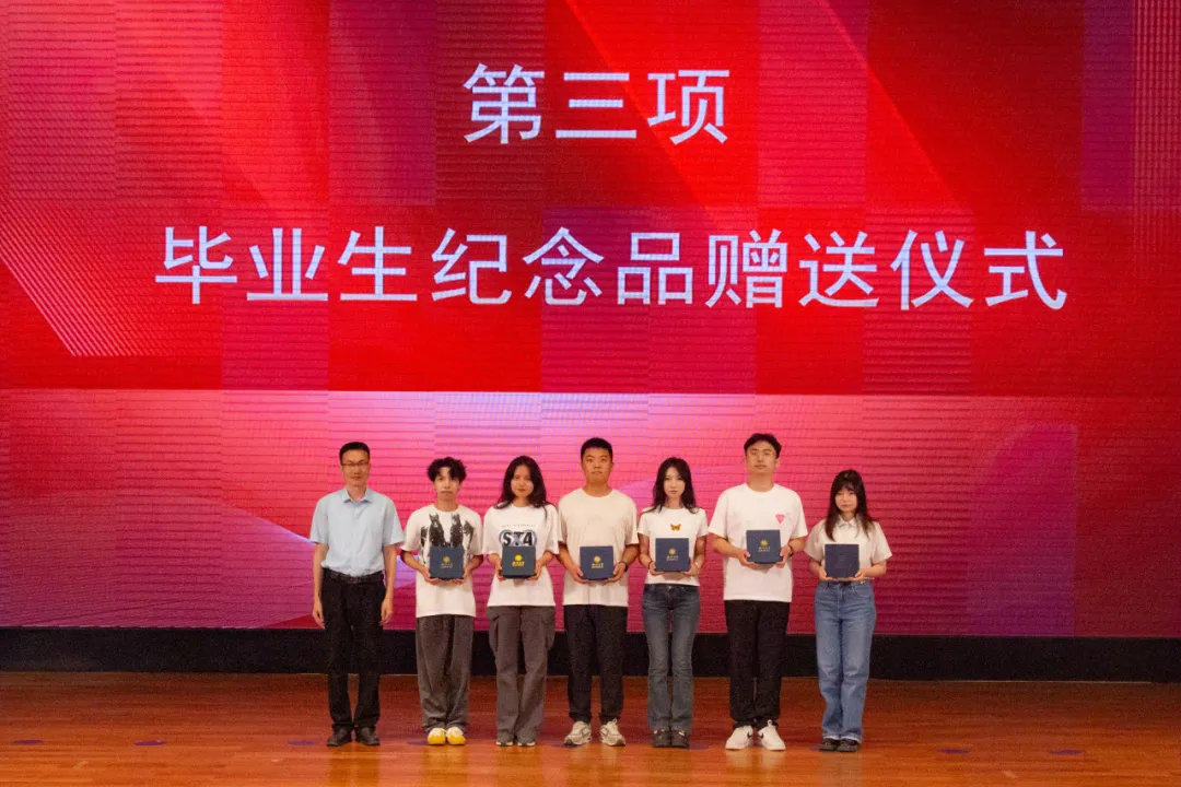 典礼第三项:学院领导和各系教师代表向2024届本硕博毕业生代表赠送了学院精心准备的纪念品黑檀木书签、签字笔和全院师生大合影,书签上雕刻着“潮涌海阔,千帆竞秀”的赠言和宏观经济大楼图案,表达了学院对毕业生的殷切期望和祝福期许。