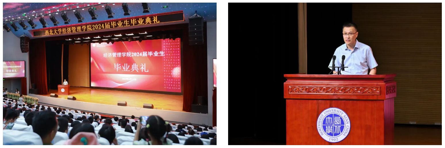 典礼第四项:毕业生代表发言。2024届本科毕业生代表高建瓴,研究生代表张陈璇分别发言。她们回顾了自己在西大经管的求学历程和在校生活的青春时光,表达了师生之间的深厚情感和对学院培养的真挚感谢。她们表示,毕业是人生新阶段的开始,将继续带着母校和母院“怀经世之心,立济民之志,学以致用,不负韶华”的嘱托和期望,在各自的人生道路上,活出西大经管人的模样。
