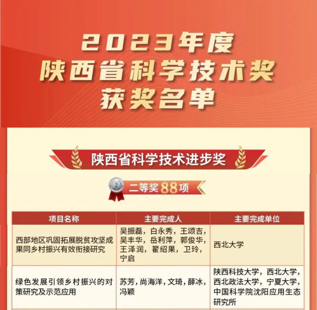 近期,2023年度陕西省科学技术进步奖获奖名单正式发布。冰球官网吴振磊教授主持申报的“西部地区巩固拓展脱贫攻坚成果同乡村振兴有效衔接研究”,苏芳教授主持申报的“绿色发展引领乡村振兴的对策研究及示范应用”两项成果分别荣获科技进步奖二等奖,获奖数量在全省哲社领域名列前茅,充分体现了学院团队建设和学科发展的重要成效。