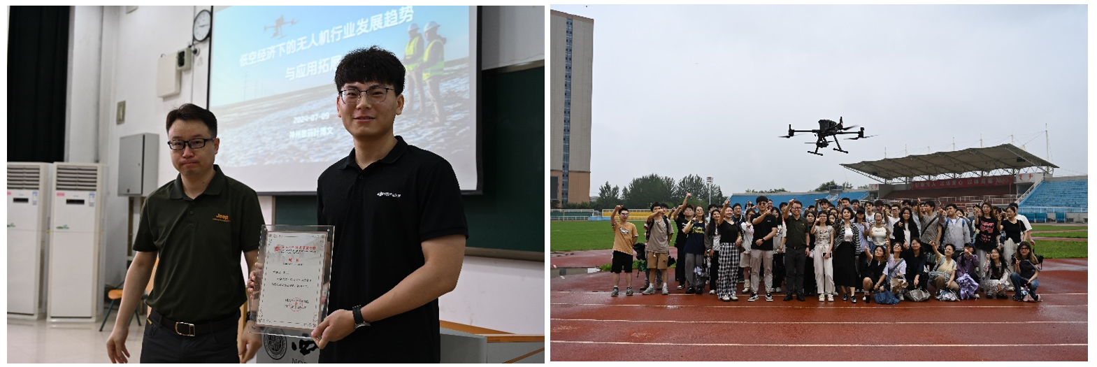 来自神州数码集团渠道专业总监、低空培训中心全国负责人叶博文先生介绍了低空经济的现状及未来发展前景。无人机行业作为低空经济的重要组成部分,已在公安、农业、消防、交通运输等多场景下高效、安全地应用。这些成功案例展示了无人机在搭载不同的装备后可以协同人工或者自动完成情境化的任务。最后,神州数码团队在室内与室外分别向同学们展示了无人机的智能飞行、红外测温识别、高清拍摄等功能,引起了同学们的极大的兴趣。上图一为高鹏老师给叶博文先生颁发“冰球突破豪华版官方网站实践周行业导师”证书。