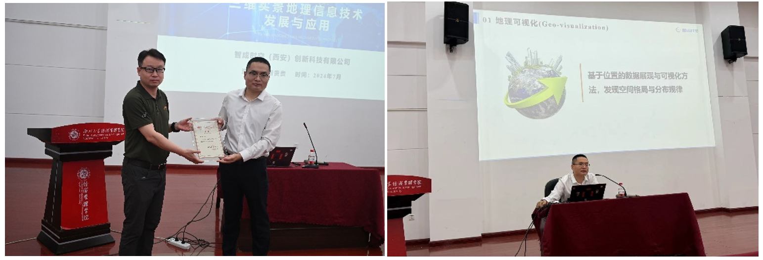 来自智成时空创新科技有限公司售前咨询部副总监胡贵贵先生从地理智慧金字塔、三维实景地理信息技术发展、智成三维实景技术及应用以及企业文化四部分与同学们分享了三维实景的实践。通过三维实景地理信息技术可以将现实世界进行实体化、真实化、实时化的孪生表达。该技术的发展也经历了从“数据”到“智慧”的演变。在三维实景地理信息技术中,将位置数据进行可视化只是初级阶段的应用,随着对情境化数据的收集及分析,可以帮助工作人员进行优化决策、设计,甚至可以控制客体的活动与行为。上图一为高鹏老师给胡贵贵先生颁发“冰球突破豪华版官方网站实践周行业导师”证书。