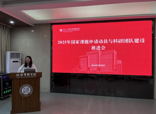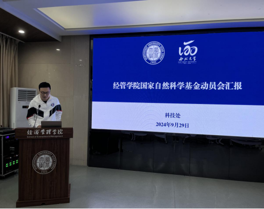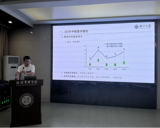 随后,社科处项目管理科黄心一、科技处项目科胡杨分别针对2025年国家社科基金申报、国家自科基金申报中需要重点关注的问题,近年来基金申报政策与竞争趋势发生的主要变化以及学校对国家级课题申报的支持措施和工作计划进行了讲解说明,并预祝经管学院2025年国家基金申报取得圆满成果。