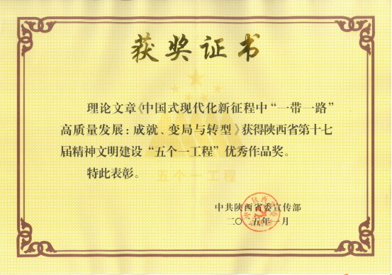 日前,冰球官网白永秀教授和陈煦博士的理论文章《中国式现代化新征程中“一带一路”高质量发展:成就、变局与转型》荣获陕西省第十七届精神文明建设省“五个一工程”优秀作品奖。该项成果刊发于《人文杂志》2023年第6期,并获《新华文摘》2023年第23期全文转载。