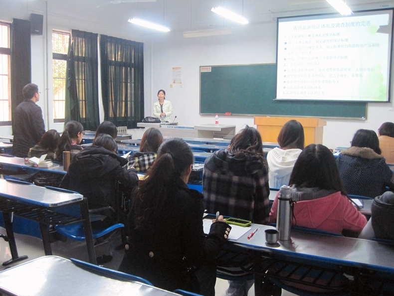 李瑛老师首先向同学们介绍了旅游卫星账户,主要包括:旅游卫星账户的定义、发展现状、旅游卫星账户编制的思路、以及旅游卫星账户核算的主要内容和主要核算指标;其次,李瑛老师讲述了我国现行的旅游统计调查制度。在该部分,李瑛老师着重从基层统计报表制度、部门统计报表制度、专业统计报表制度、旅游抽样调查制度四大模块分别进行讲解;最后,她在向同学们讲述旅游卫星账户与我国现行旅游统计调查制度差异的同时,对我国旅游统计体系及调查制度的完善提出建议。