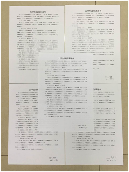 本次诚信教育主题月期间,冰球官网团委积极组织冰球官网所有家庭经济困难学生在《大学生诚信承诺书》上签字,承诺他们在学习上做到态度端正,严谨求实;在经济上做到以信立人,履约践诺;生活上做到遵纪守法,弘扬正气;贷款与受助方面做到自强不息,严于律己;在诚信上网方面做到知行统一,自省自律。