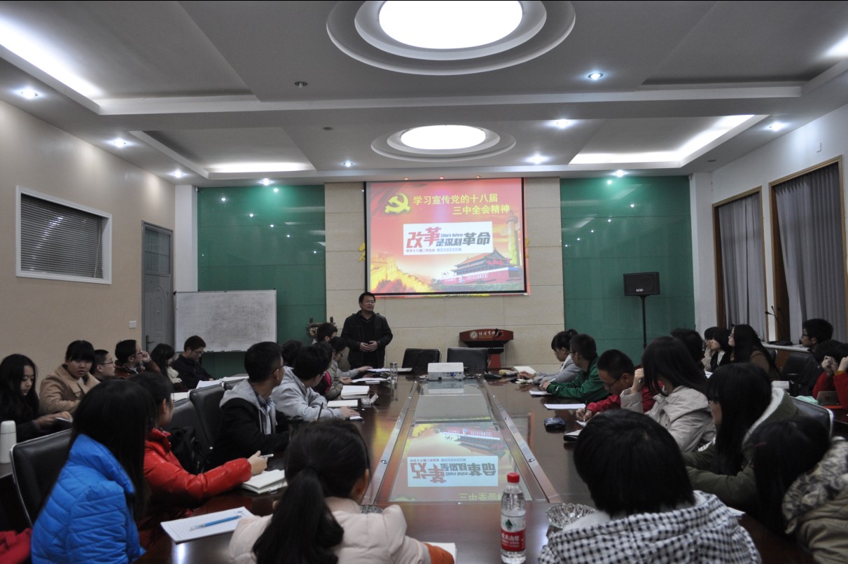12月2日晚,院团委组织召开的学习宣传“党的十八届三中全会精神”会议在一层会议室举行,40多名来自本科各年级的学生团干参加了会议。