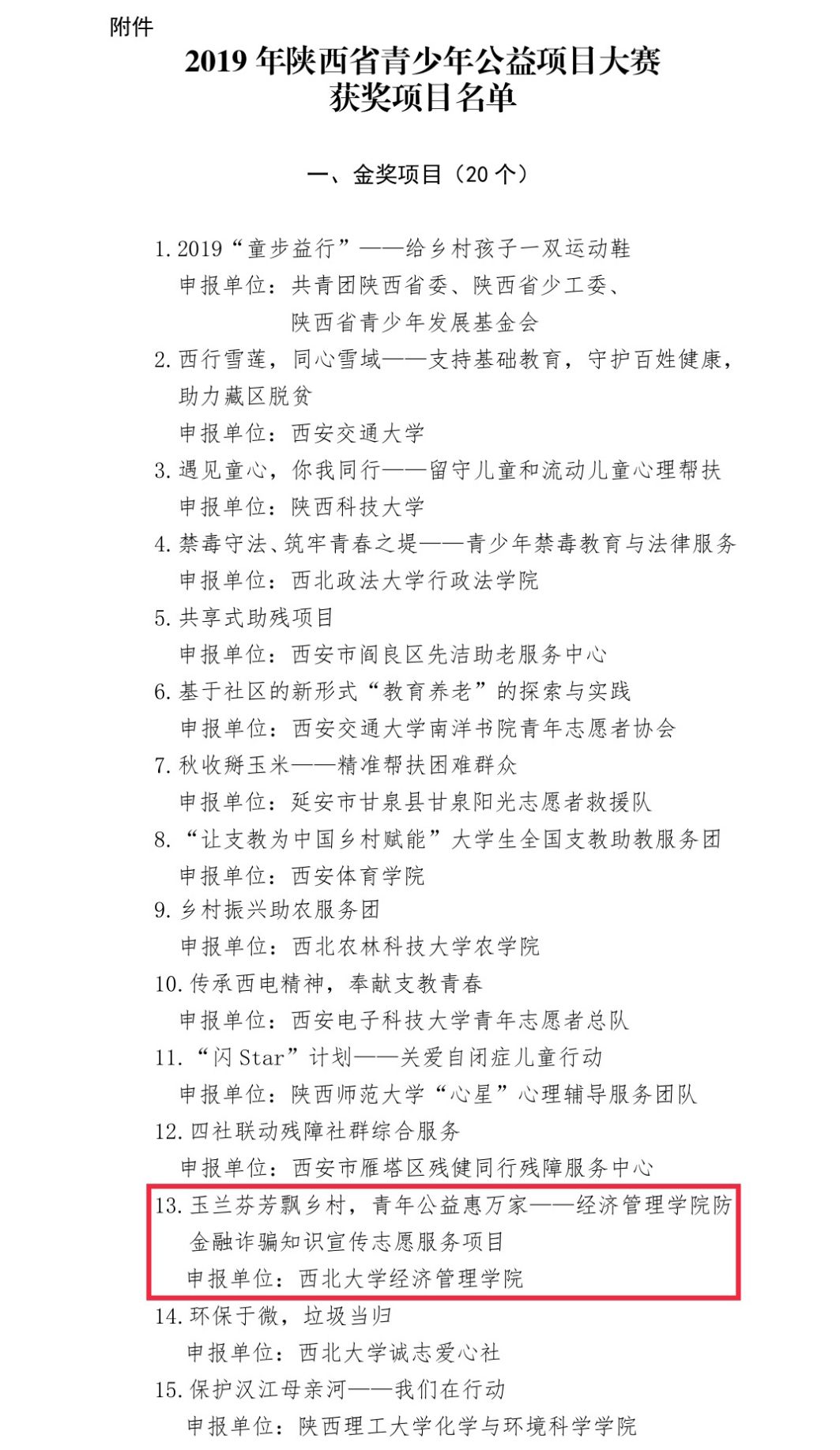 由冰球官网团委史歌老师指导,2017级金融工程班安亭樾主持申报的项目《玉兰芬芳飘乡村,青年公益惠万家--冰球突破豪华版官方网站防金融诈骗知识宣传志愿服务项目》,喜获2019年陕西省青少年公益项...
